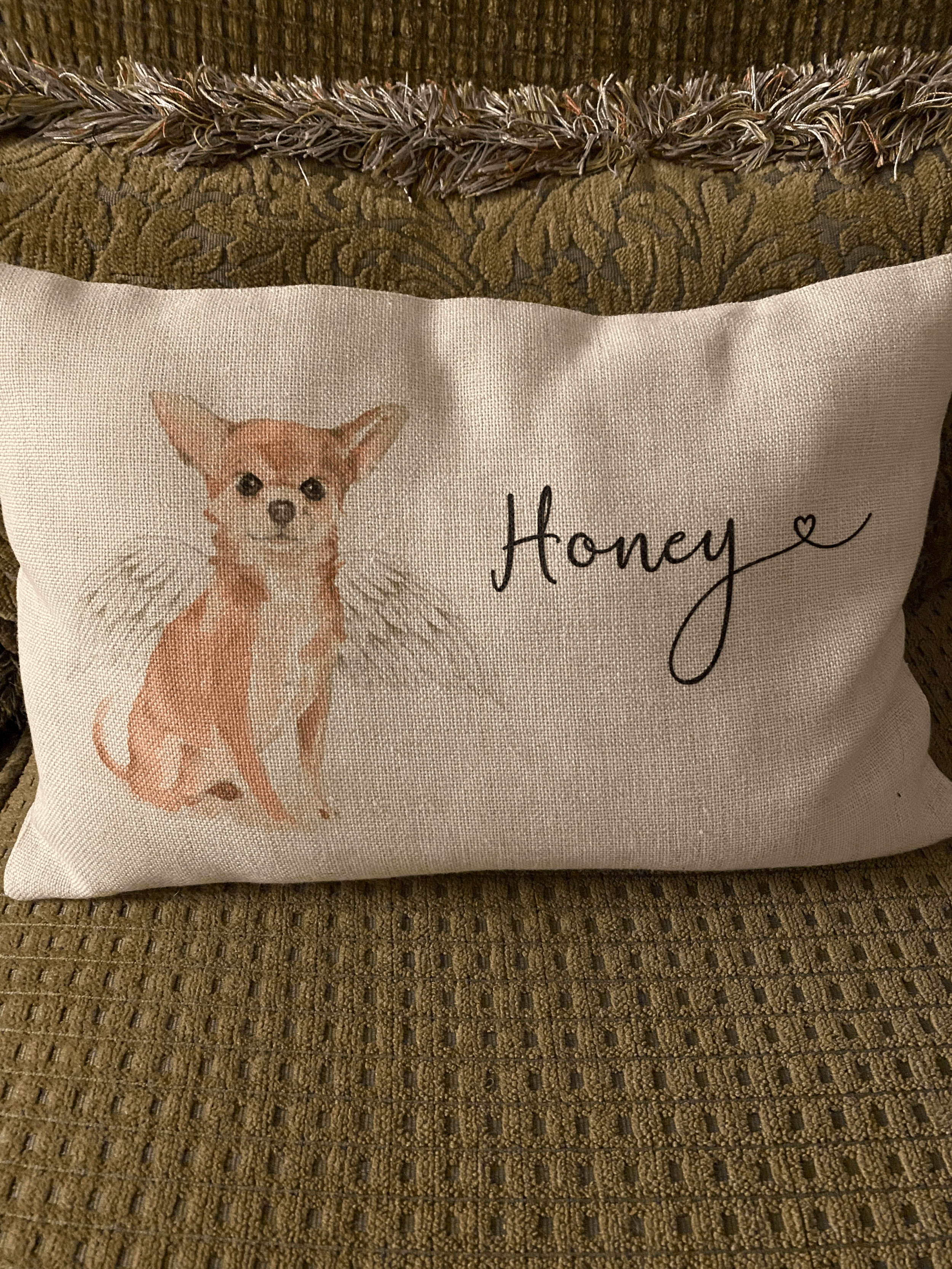 Last week, we had a reading with a pet psychic. It was my second time with her, and this reading was all about connecting with Honey. The parts I want to share are the ones that affirmed my knowing and deepened my beliefs even more. She said Honey kept bringing up something about a bed or sheets. I said my daughter had just gotten a new bed. She said, “Honey is saying, I could never have gotten up there.” Which is true! She also said Honey keeps mentioning a pillow with a picture of her on it — and there is one. After Honey passed away, my daughter’s friend ordered her a pillow of a Chihuahua that looked like Honey, with angel wings and her name embroidered on it.